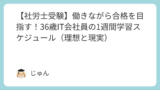 勉強時間としては講義を含めて週15時間を目標に取り組むようにしていますが、現実は10時間前後だったりします。仕事の具合や休日の予定、趣味との折り合いなど本当にさまざまな外乱がありますが、できないときはできない!やれないときはやらない!という気持ちも持つようにしています。